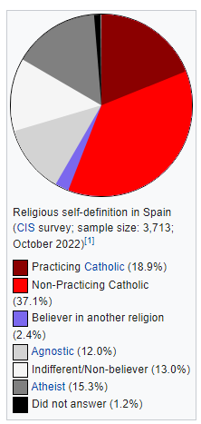According to the Spanish Center for Sociological Research, 57.6% of Spanish citizens self-identify as Catholics, (38.7% define themselves as not practicing, while 18.9% as practicing), 2.8% as followers of other faiths (including Islam, Protestant Christianity, Buddhism etc.), and 38.1% identify as atheists (13.9%), agnostics (10.6%) or non-believers (13.6%) as of January 2022.